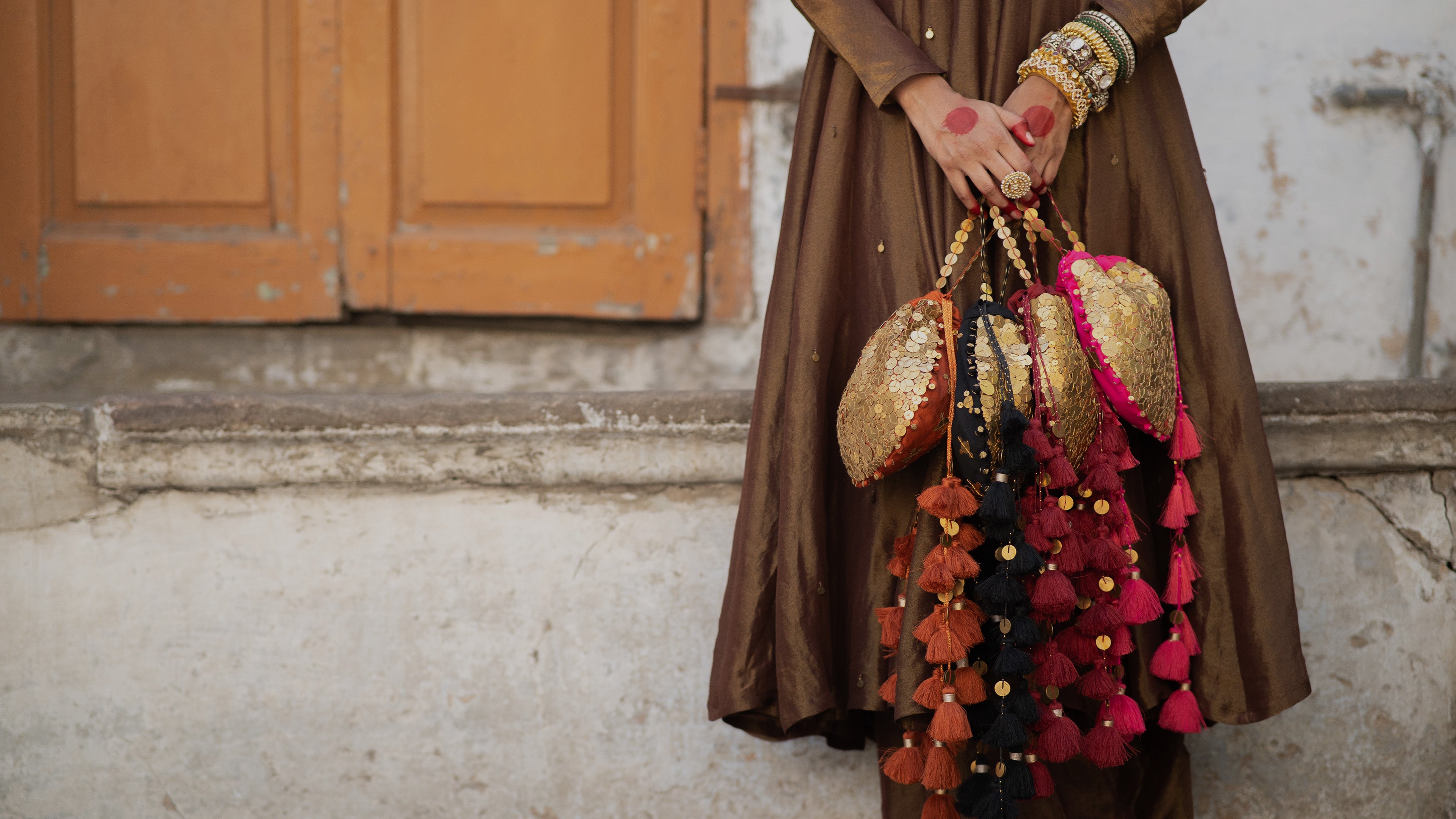 Handcrafted potlis adorned with delicate brass coins that catch the light with every movement. Finished with vibrant tassels, balancing heritage detail with festive elegance.
