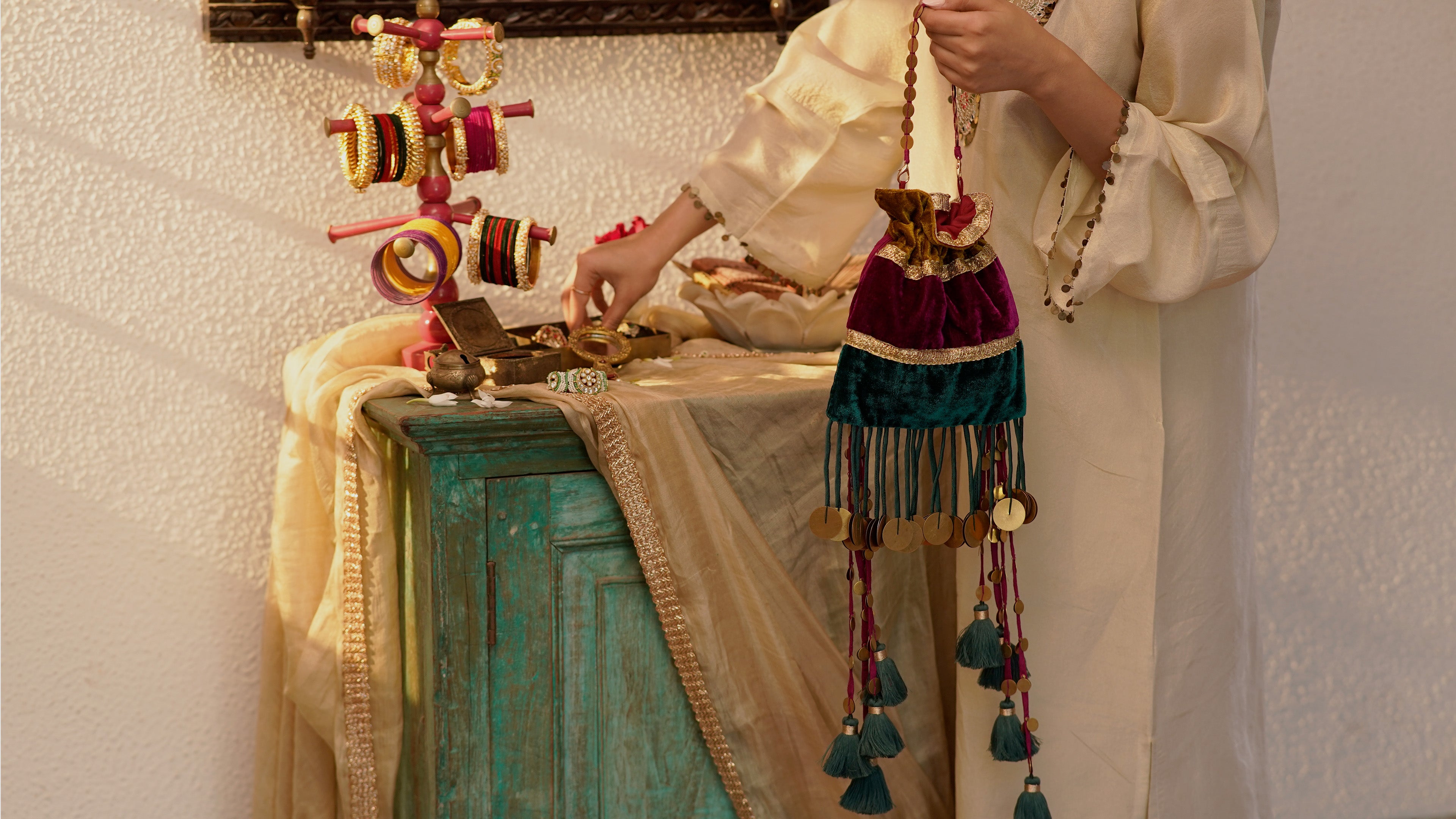 Handcrafted velvet potlis adorned with intricate embellishments and cascading tassels. A regal, spacious accessory that brings warmth and elegance to festive occasions.