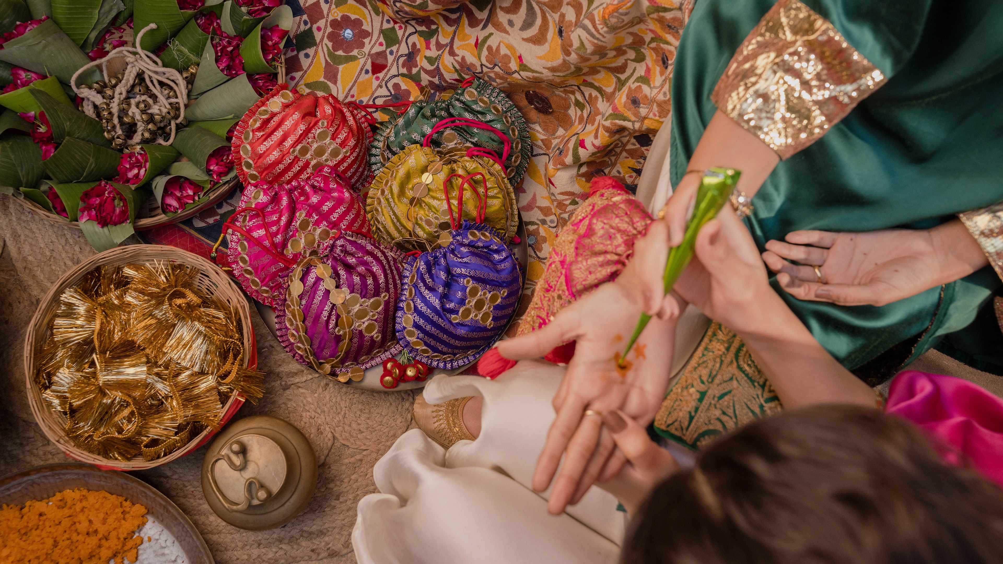 Handcrafted bags in sheer Mashru silk with shimmery patches and colorful tassels. Finished with brass-coin-accented handles for a subtle, regal touch.